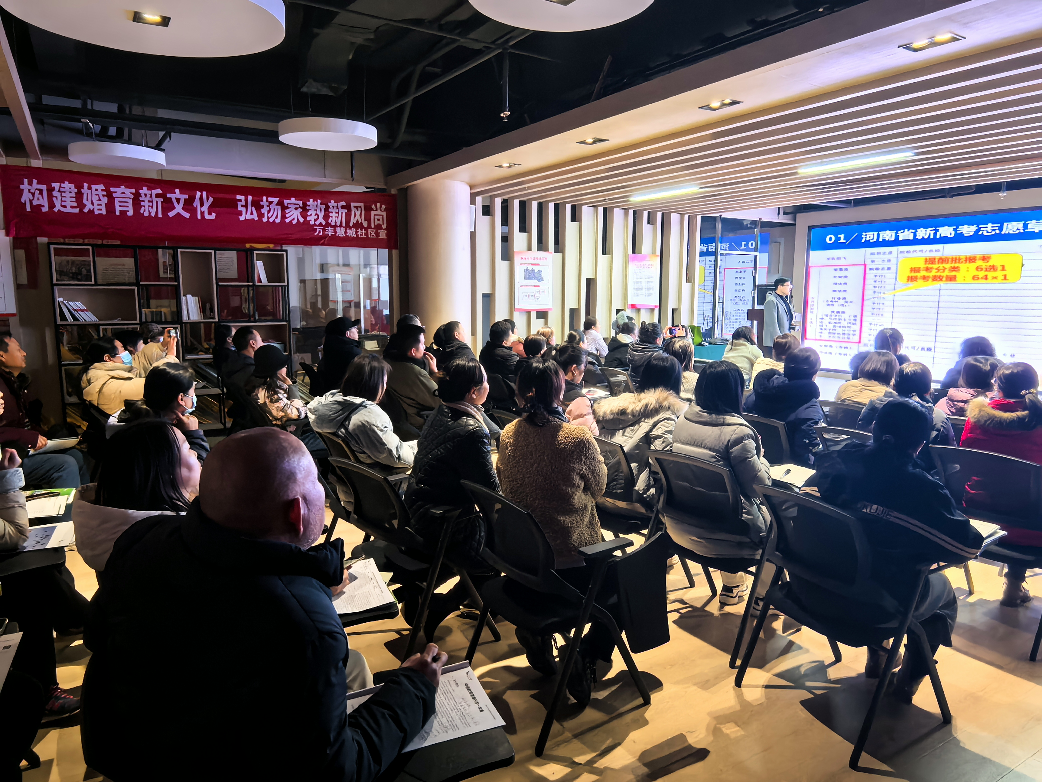 伴随着双减政策和高考制度的不断改革,2025年河南省将迎来首届新高考,正值高三学子八省联考分数排名新鲜出炉之机。2025年3月6日晚,郑州高新区枫杨办事处万丰慧城社区“陪读妈妈的朋友圈”项目迅速行动,链接辖区知名教育机构在高新区新时代文明实践站开展了一场酣畅淋漓的志愿填报专题服务讲座,为辖区陪读家庭送去了惠风春霖。