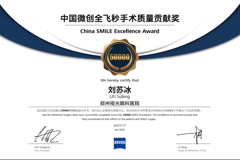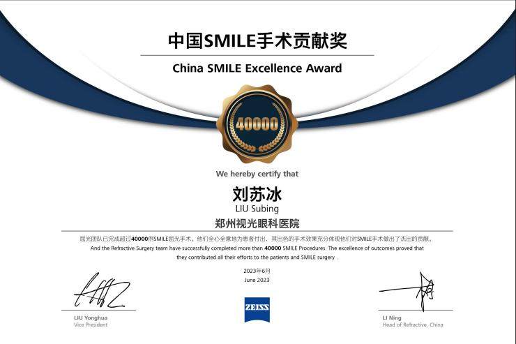 2024年6月,郑州视光眼科医院微创全飞秒手术突破40000例,是当时河南省内首家微创全飞秒超40000万例的医院,获得蔡司公司颁发的“SMILE手术贡献奖”。