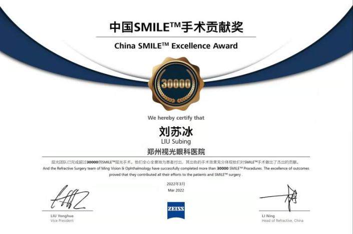 在微创全飞秒激光矫正近视的路上,郑州视光眼科医院始终占据着绝对优势地位,多次获得微创全飞秒手术质量贡献奖。2022年3月,郑州视光眼科医院微创全飞秒手术突破3万例,是当时河南省内首家微创全飞秒超3万例的医院,获得蔡司公司颁发的“SMILE手术贡献奖”。