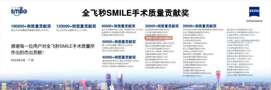 2023年3月,在“蔡司屈光中国用户会”上,蔡司公司微创全飞秒SMILE手术质量贡献奖官方数据通报:郑州视光眼科医院累计手术量突破37000例,位居河南省第一!