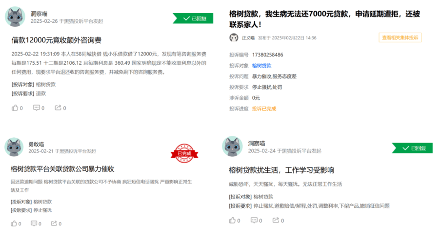 有用户投诉称,榕树贷款天天骚扰,威胁恐吓,导致其无法正常生活。另有用户投诉称,自己生病无法还款,申请延期被拒绝,还被联系了家人。此外,还款逾期不协商,疯狂短信电话骚扰;不合理收取贷款担保费、咨询费;盗取用户信息等投诉屡禁不止。
