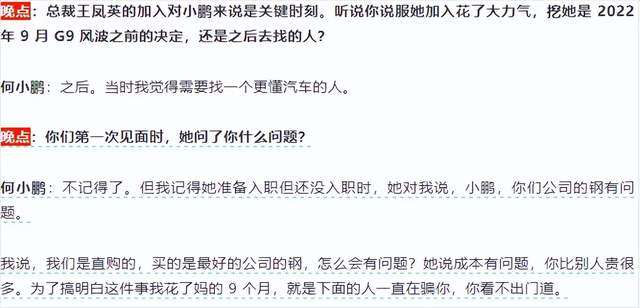 在之前,晚点的采访中,就曾提到王凤英说小鹏的钢成本有问题,何小鹏为了搞明白这件事,说“我花了妈的9个月,就是下面的人一直在骗你”。连粗口都爆出来了。