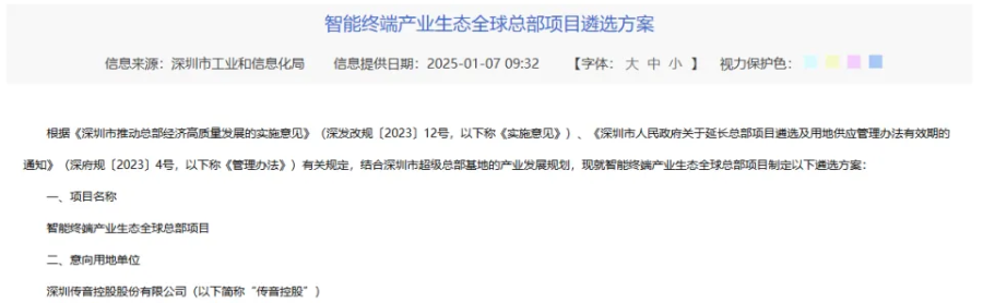 近日,深圳市工业和信息化局发布的《智能终端产业生态全球总部项目遴选方案》显示,深圳传音控股股份有限公司成为该项目的意向用地单位,拟竞得深圳湾超级总部基地DU02-03地块,用于建设全球总部项目。