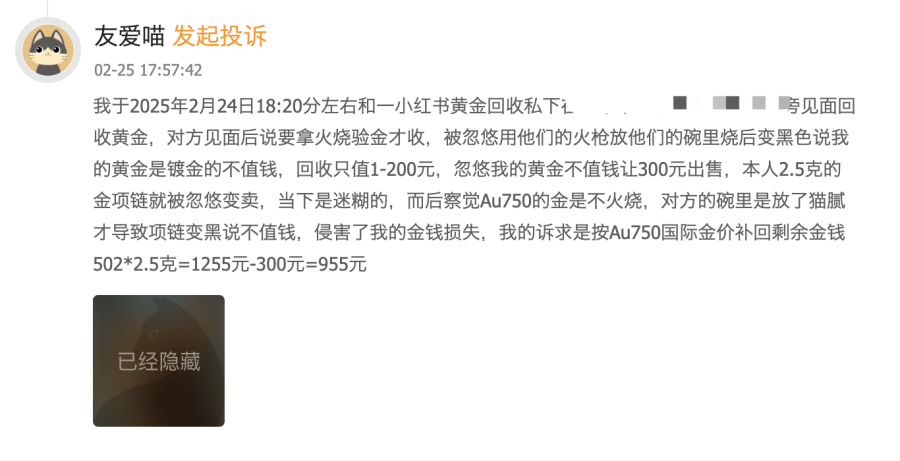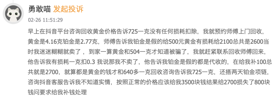 围绕黄金回收讨论最多的话题之一是回收过程中的各种套路。黑猫投诉上,以“黄金回收”为关键词搜索可以看到近2000条投诉,多以虚报高价、损耗折价、变相放贷等为主。