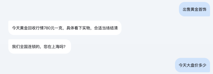 蓝鲸记者以黄金回收为关键词搜索点某回收广告,多家回收商给到的黄金首饰价格在776元-780元左右,而今日的黄金大盘价为676元/克。前述上架的报价比大盘价还要高出100多块。业务员对此的解释是,“我们有自己的柜台,不影响二次出售的话我们可以直接当成品销售的,所以价格给的有优势”。