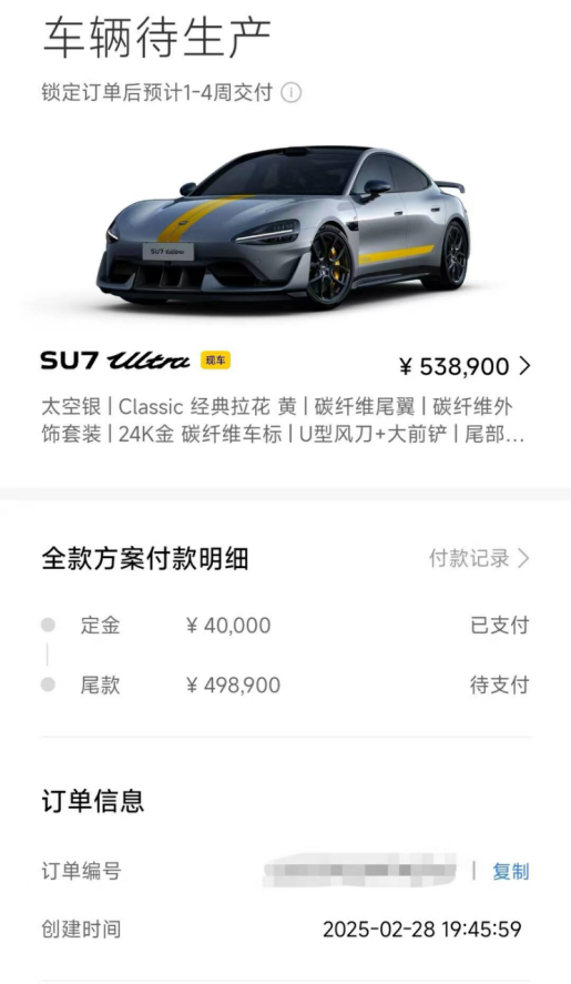 而在看到小米SU7创始版在二手市场的保值消息后,何城改变了主意,并花了53.89万元入手了SU7 Ultra。尽管没抢到长续航的轮胎,只剩下高性能胎可选,何城还是在标准版52.99万元的基础上加了9000元选了自己喜欢的颜色。