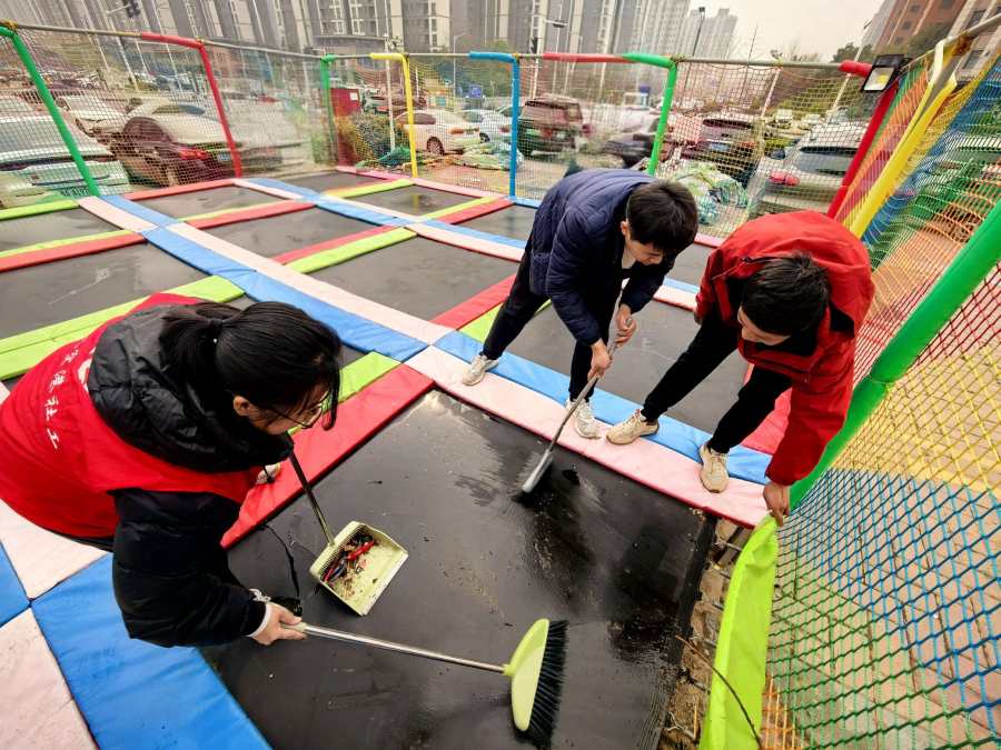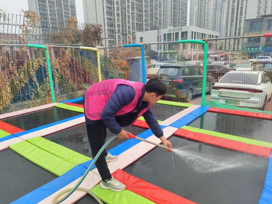社工在前期入户走访过程中得知,辖区内有一户困境儿童家庭经营一处儿童蹦床游乐项目,冬季因天气因素暂停营业,随着天气转暖,为增加家庭收入,缓解生活困难,准备继续营业。由于其身体因素,不便劳累。开业前,社工联合唯品会运营中心志愿者帮助其对蹦床进行清洁打扫。当日,三名社工与三名志愿者早早来到蹦床项目经营处,由于长期未使用上面堆积了大量的垃圾,污水等,针对现场情况大家分工明确,迅速投入到紧张的清洁工作中。社工与志愿者手持清洁工具,仔细清理蹦床表面的灰尘、污渍,对每一个角落都不放过。随后社工和志愿者又对乐园的防护设施、栏杆进行冲洗。在清理过程中,大家还对蹦床的弹性、稳固性进行了简单检查,及时发现并解决潜在问题。经过数小时的辛勤努力,原本略显杂乱的蹦床乐园焕然一新。