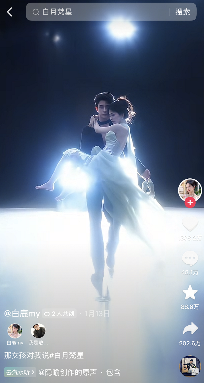 关于剧宣堪比“官宣”的超绝氛围感,还要从白鹿与敖瑞鹏合作的《白月梵星》说起。该剧播出后,白鹿与敖瑞鹏以共创的形式在抖音发布了一条变装短视频,原本一身睡衣的两人,变装后西装革履、长裙翩翩的单手公主抱,以极具反差的视觉冲击和顶格氛围感,拉出了内娱剧宣新的天花板。截至目前,该视频累计点赞超1300万。