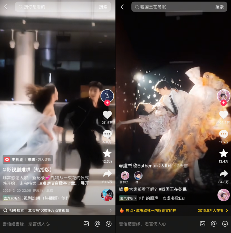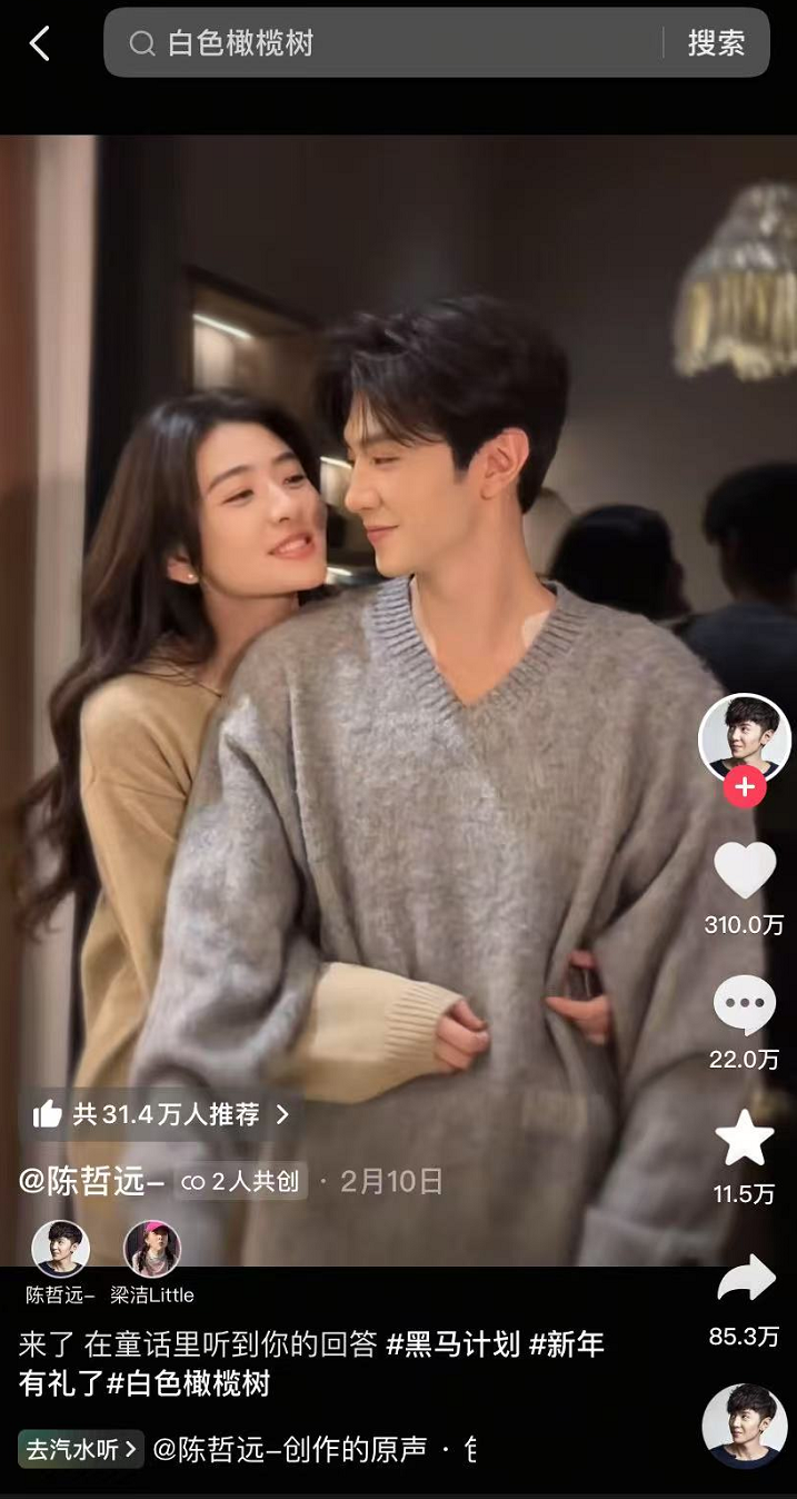 而最近《嘘,国王在冬眠》播出后,氛围感剧宣再次掀起高潮,虞书欣、林一在飞扬的花瓣中起舞对望,目前该视频点赞已超过400万。此外,《白色橄榄树》献出另一条高赞视频,主演梁洁、陈哲远的“日常相处”甜度爆表,BGM更是直接选取《咱们结婚吧》,堪称大型“官宣”现场。