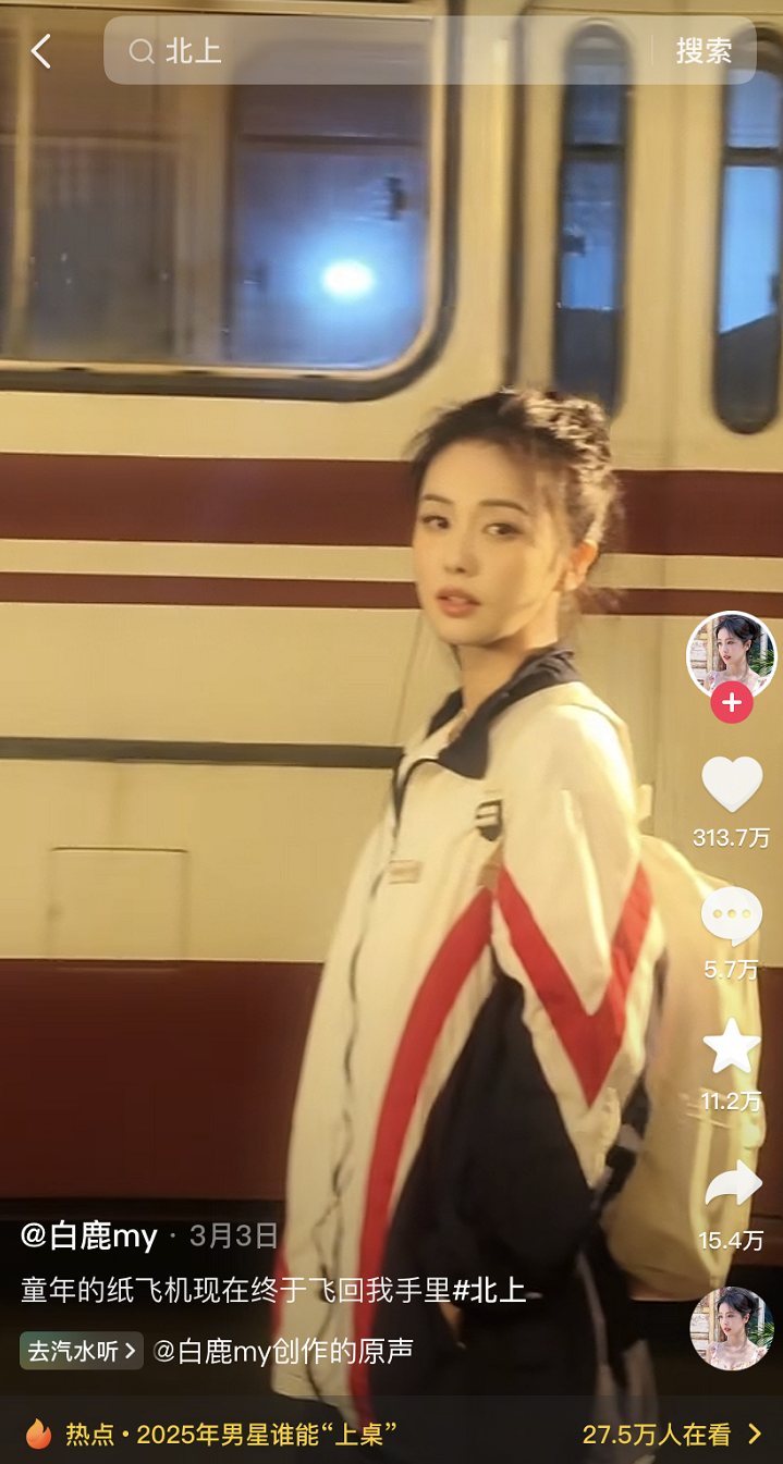 除了与现偶、古偶契合的高糖氛围外,年代剧《北上》播出期间,白鹿发布的一条视频点赞也在300万以上。视频中,步入社会的夏风华(《北上》女主,白鹿饰),向学生时代的她挥手,路过的一辆公交车隔开了两个时空,年代感扑面而来。这也反映出,基于剧集题材差异,营造氛围感的剧宣形式,还有更多值得挖掘的