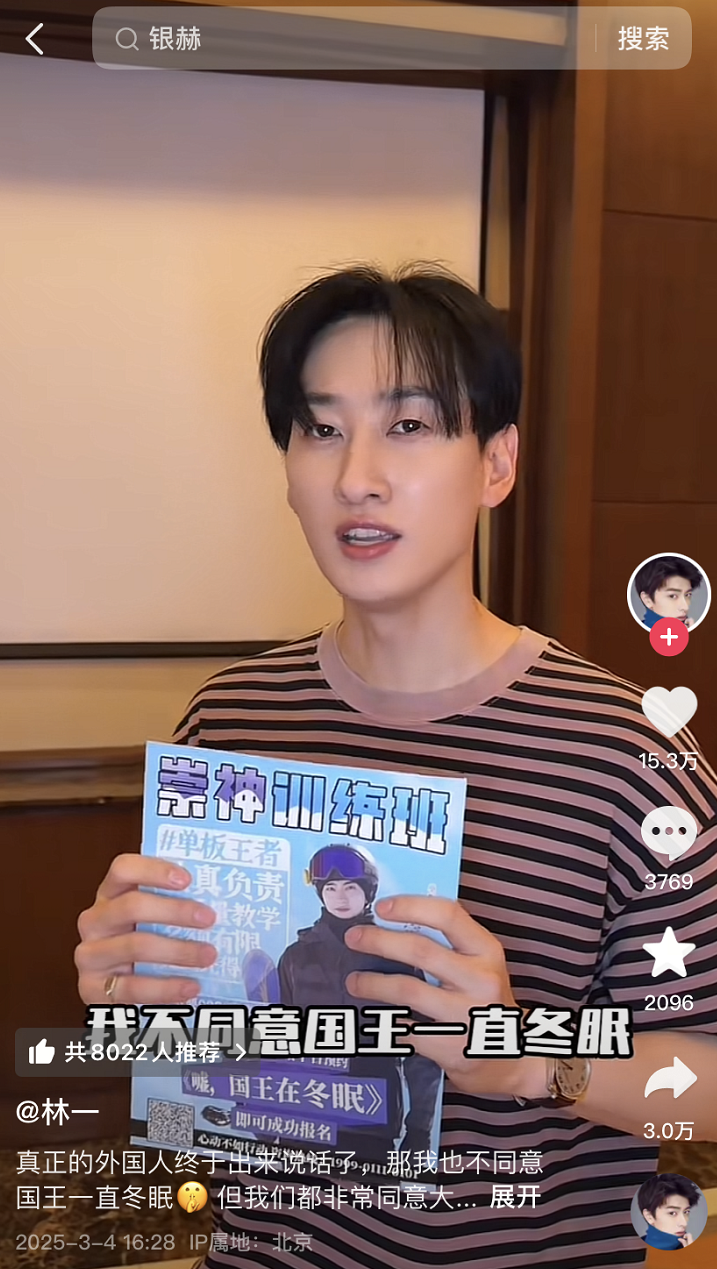 同样熟悉各种热梗的还有林一。《嘘,国王在冬眠》定档之后,林一无处不在的剧宣甚至已经到了“走火入魔”的程度,宣传方式更是让人哭笑不得。他一边在微博玩梗发文:“我同意收工后马上打开优酷去看《嘘,国王在冬眠》。”一边将海报打印成宣传页,走到哪儿发到哪儿,除了粉丝、路人,黄明昊也在生日会上收到了宣传海报,连跟韩星银赫一起跳舞期间,林一都不忘让其拿着海报用中文玩梗:“我是外国人,我不同意让国王一直冬眠。”