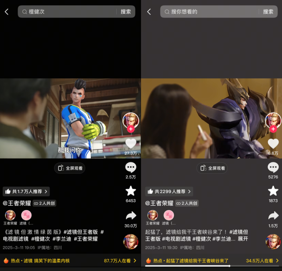 从《滤镜》早期宣发,到后来更多物料释出,羊驼都是其中的一个关键元素。对比其他剧集,高赞的剧宣内容多是氛围感视频,而在《滤镜》官抖,目前点赞最高的视频则是谭健次与一只羊驼的对视。线下粉丝见面会上,女主的扮演者李兰迪骑着羊驼玩偶入场,后来的参访中,李兰迪和谭健次还曾一起模仿羊驼吐口水。甚至基于变身设定,《王者荣耀》还与《滤镜》剧组共创内容,其中,女主变身成身着“激情绿茵”皮肤的马可波罗,引得网友直呼:“这辈子也是没想到谭健次能和激情绿茵同框哈。”