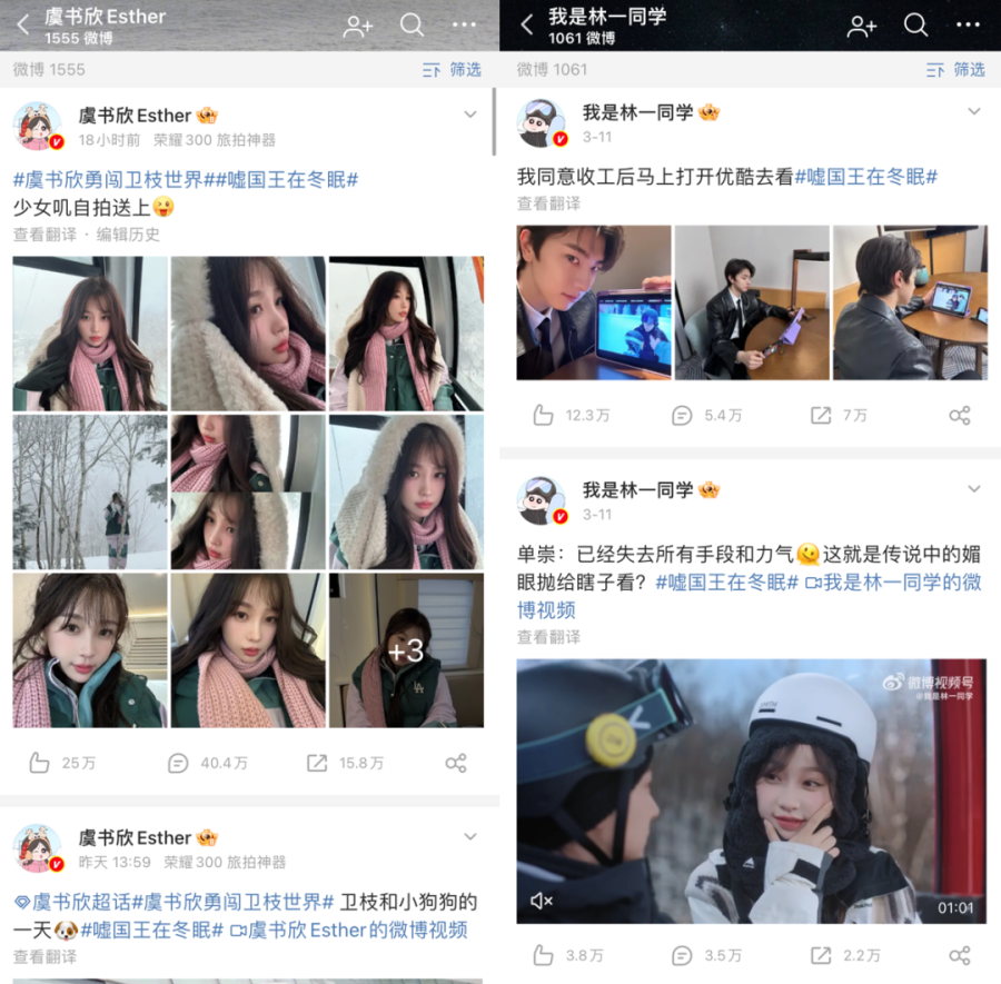 《嘘,国王在冬眠》播出后,林一和虞书欣在微博换上了情侣头像,两人更新的内容中也不乏与剧情相关的滑雪内容,仿若剧中的两个角色在现实中真实存在。