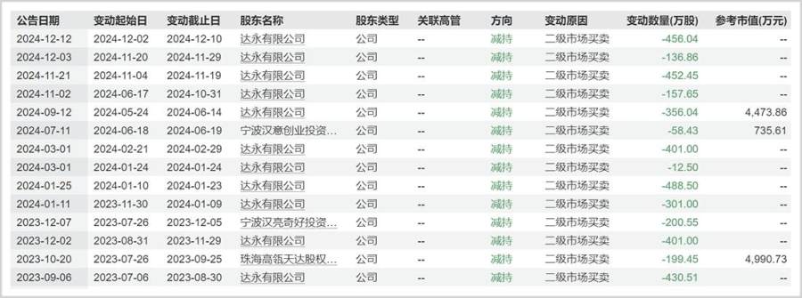 在这种背景下,公司大股东频频减持。2月11日,第二大股东达永有限公司计划减持不超过3%的股份。值得注意的是,该股东在近年已经多次减持,减持比例累计超过14%。
