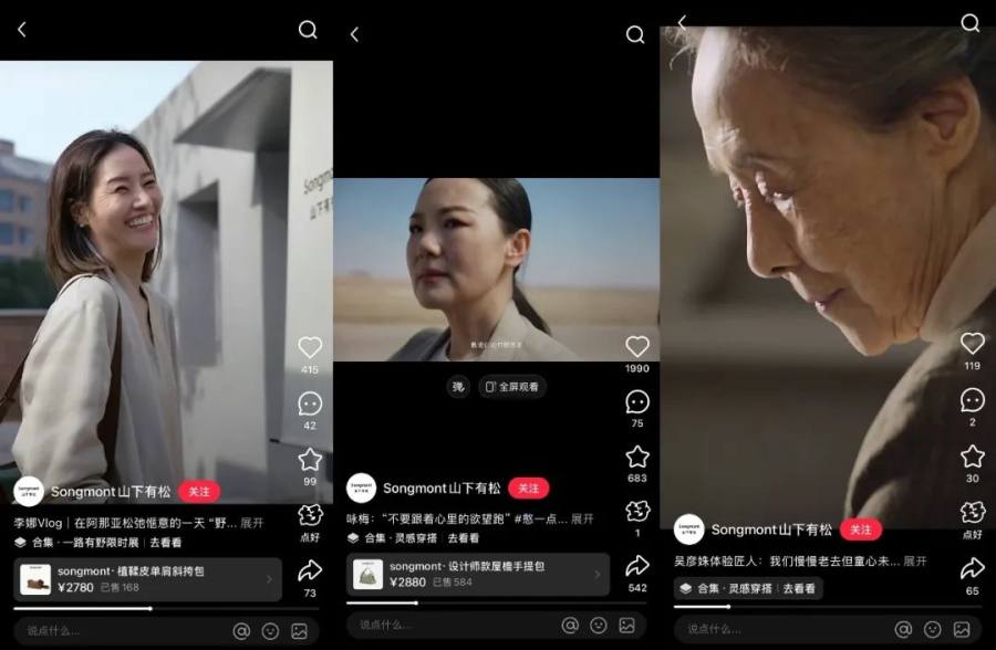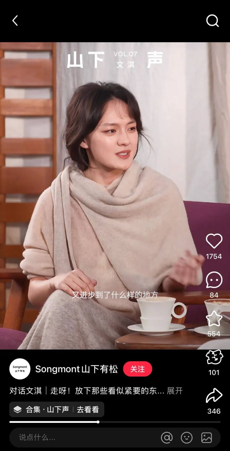在实操上,山下有松还有一个值得品牌学习的内容玩法,就是最大程度挖掘品牌合作伙伴的内容,以此次文淇的合作为例,视觉大片、品牌TVC、翻包视频、对谈视频、播客、甚至文淇的拍摄的vlog......几乎是全方位产出了充分的品牌物料,满足了横屏竖屏、长短内容、音频视频、静态动态多维度的内容供给。