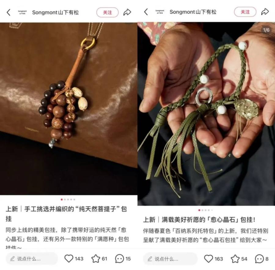 同样的,在山下有松的语境里,挂件不仅仅是一个简单的饰品,是集合了东方美宣、玄学、情怀的小物件。“菩提子”包挂是由手工精心挑选的6种“纯天然菩提子”编织成串,蕴藏着生命力和希望;“愈心晶石”包挂是未经人工雕琢的纯天然晶石,可以静愈心灵。
