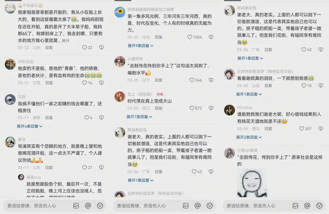 “没有人能够永远赶上时代浪潮”“时代落在肩上变成大山”,层层压下的债“击鼓传花到了最底层人的手上”……评论区,有运河儿女的“现身说法”,也有新一代对父辈的理解和感同身受。观众们既为他的失意共情,也为他的“执着”而不平。
