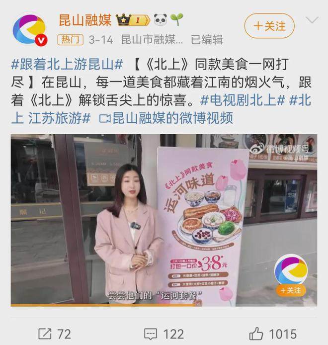 随着《北上》热播,剧中内容为地方文旅提供了丰富的素材和热议话题切口,剧中同款美食、运河申遗成功、跟着《北上》游昆山……剧内话题激活了大批文旅账号积极启动对文化和家乡的传播。爱奇艺更是与多方资源协同,共同将现实大剧的影响力落到方方面面,推动剧迷对运河文旅的了解不断加深。