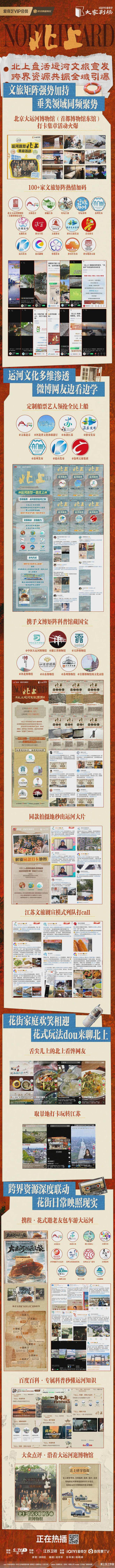 《北上》发起的北京大运河博物馆的打卡集章活动,吸引了100+文旅机构的矩阵化跟进,运河大片和同款打卡玩法更是让江苏文旅集体开启“剧宣模式”。同时,《北上》与携程老友会合作定制“大运河溯源之旅”路线帮助观众从看剧到旅行无缝衔接,与百度百科联合打造的“大运河科普专题”收获超8000万曝光,与大众点评合作的“沿着大运河逛博物馆”征稿活动吸引超两万人参与互动……