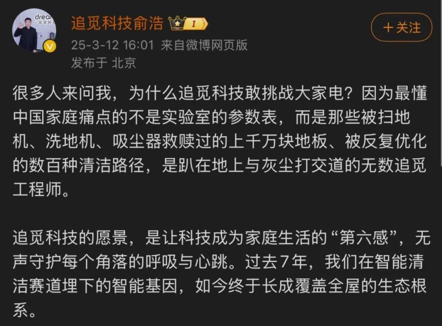 这验证了俞浩的想法:“之所以敢于挑战大家电,是因为最懂中国家庭痛点的不是实验室的参数表,而是那些被扫地机、洗地机、吸尘器救赎过的上千万块地板、被反复优化的数百种清洁路径,是趴在地上与灰尘打交道的无数追觅工程师。”