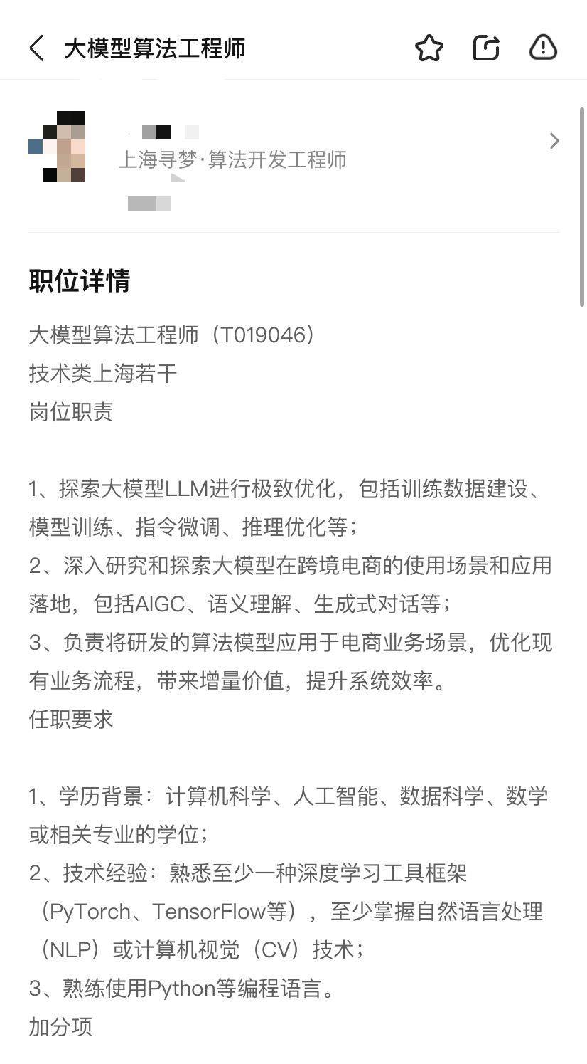 岗位职责方面,应聘者需深入研究和探索大模型在跨境电商的使用场景和应用落地,包括AIGC、语义理解、生成式对话等;负责将研发的算法模型应用于电商业务场景,优化现有业务流程,带来增量价值,提升系统效率。
