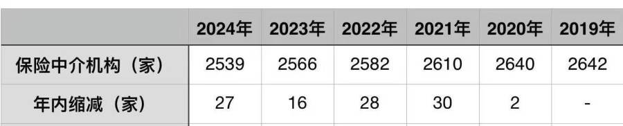 而将时间线进一步拉长,自2019年监管披露保险中介大名单以来,机构数量持续下降,2020年至2024年分别减少2家、30家、28家、16家和27家,5年间,有103家机构离场。
