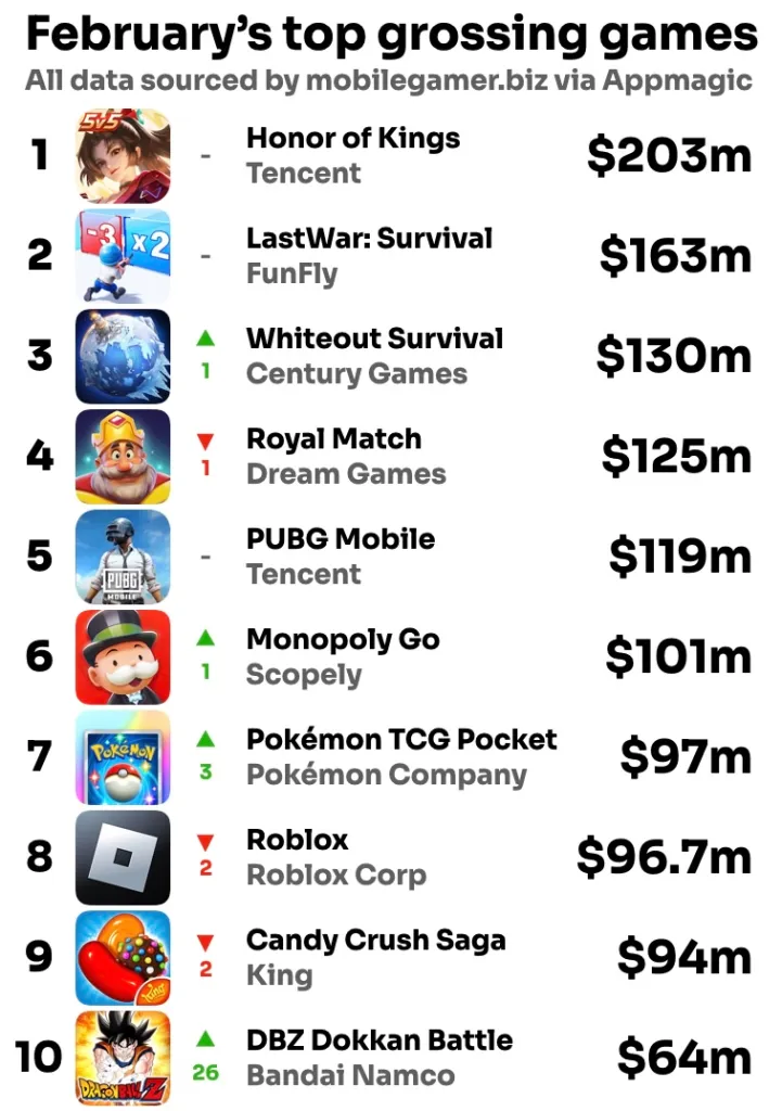 根据App Magic公布的2025年2月全球手游的收入排名榜,米哈游的原、崩、绝跌出了前十五,这是米哈游首次无任何游戏上榜。尤其是《原神》,在2月份春节断崖式的下跌67%的全球流水,即便是开放世界先驱,疲态也暴露无遗。