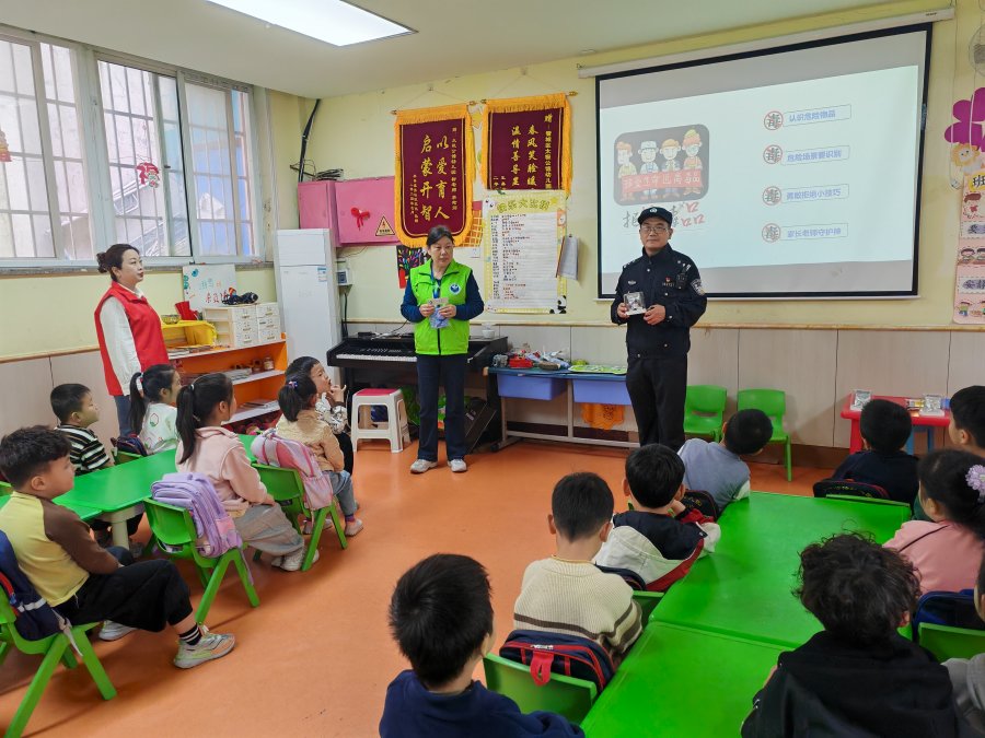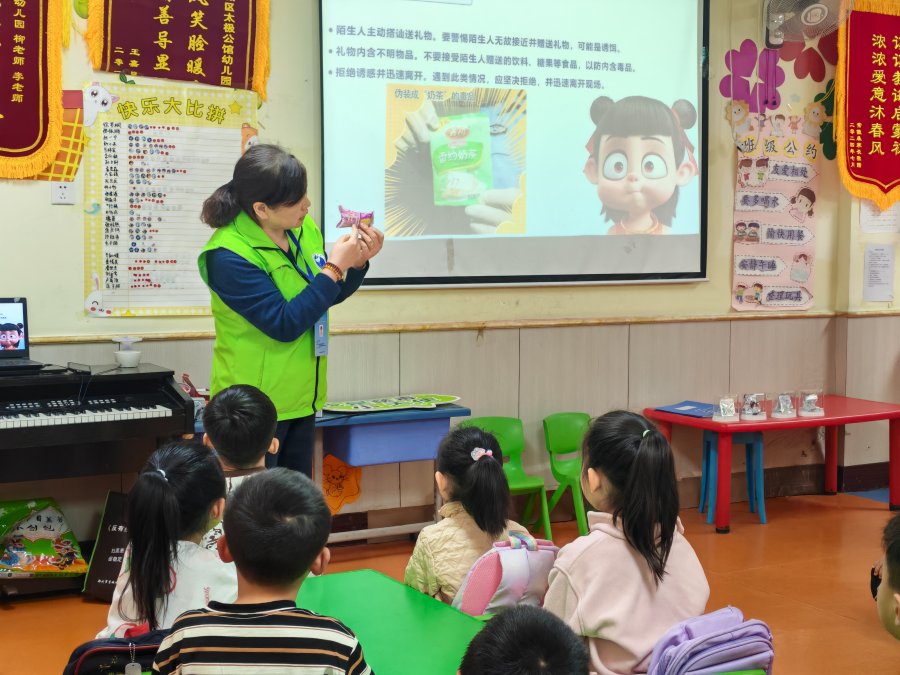 “在小小的花园里面挖呀挖呀,撒下无毒的种子,开出健康的花。”儿歌清脆纯真,眼神清澈明亮。如何培育祖国的花朵,让他们拥有美好的未来,是我们每位禁毒人不可推卸的使命和责任。为了实现这一工作目标,为孩子们创造一个绿色无毒的生活环境,3月26日,在郑州市公安局禁毒支队、管城区禁毒大队的指导下,南关街街道办事处心灵家园禁毒社工联合南关派出所民警、禁毒志愿者一起走进太极公馆幼儿园,为孩子们带去了一节别开生面的禁毒知识讲座。