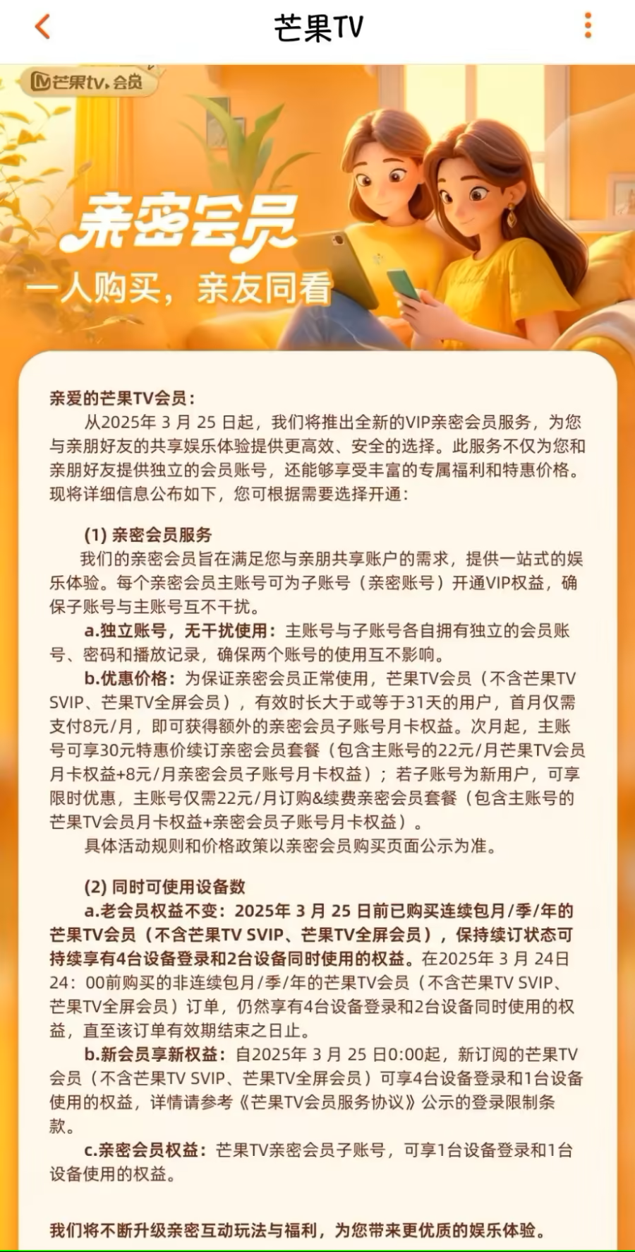 通知指出,截至2025年3月25日之前已购买连续包月/季/年的芒果TV会员(不包括芒果TV SVIP和芒果TV全屏会员),只要保持续订状态,就可以继续享有在4台设备上登录以及同时在2台设备上使用的权益。
