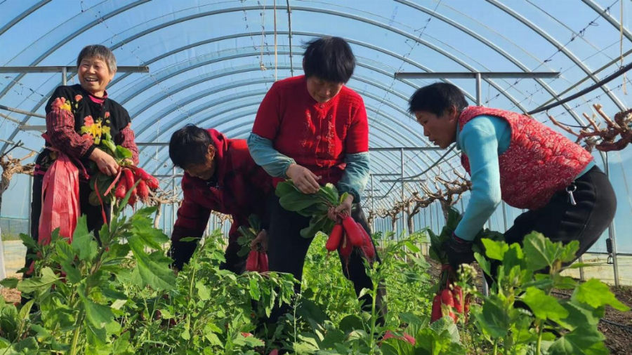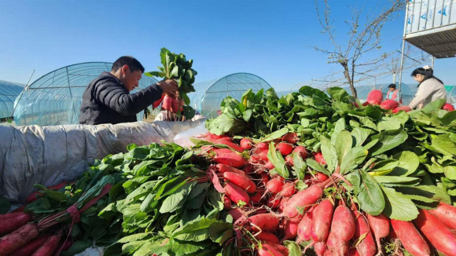 春分时节,走进河南省南阳市宛城区瓦店镇白营村,在一排排整齐的蔬菜大棚内,水萝卜、小茴香菜等进入收获期。种植户们忙着收割、装车,一幅产销两旺的春日丰收图景跃然呈现。