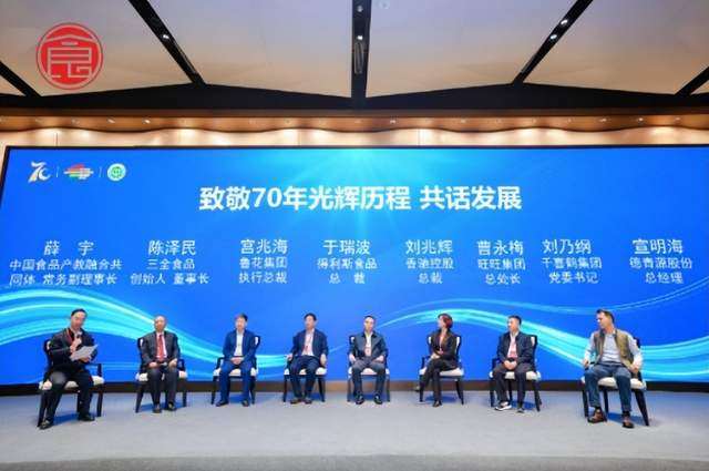 致敬食品工业发展70年,聚焦食品行业趋势,三全食品股份有限公司创始人陈泽民,鲁花集团执行总裁宫兆海,山东得利斯食品股份有限公司总裁于瑞波,香驰控股有限公司总裁刘兆辉,上海旺旺食品集团有限公司总处长曹永梅,千喜鹤集团有限公司党委书记刘乃纲,北京德青源农业科技股份有限公司总经理宣明海,就我国食品行业发展面临的挑战和机遇展开深入探讨。论坛由中国食品产教融合共同体常务副理事长、江苏食品药品职业技术学院党委书记薛宇主持。