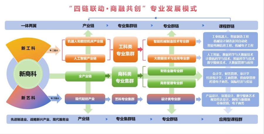 “四链联动·商融共创”的专业发展模式,即“产业链-专业群链-课程群链-能力链”四链贯通的联动机制;以新商科为主体的商工结合、商艺结合的商融共创的专业发展模式。