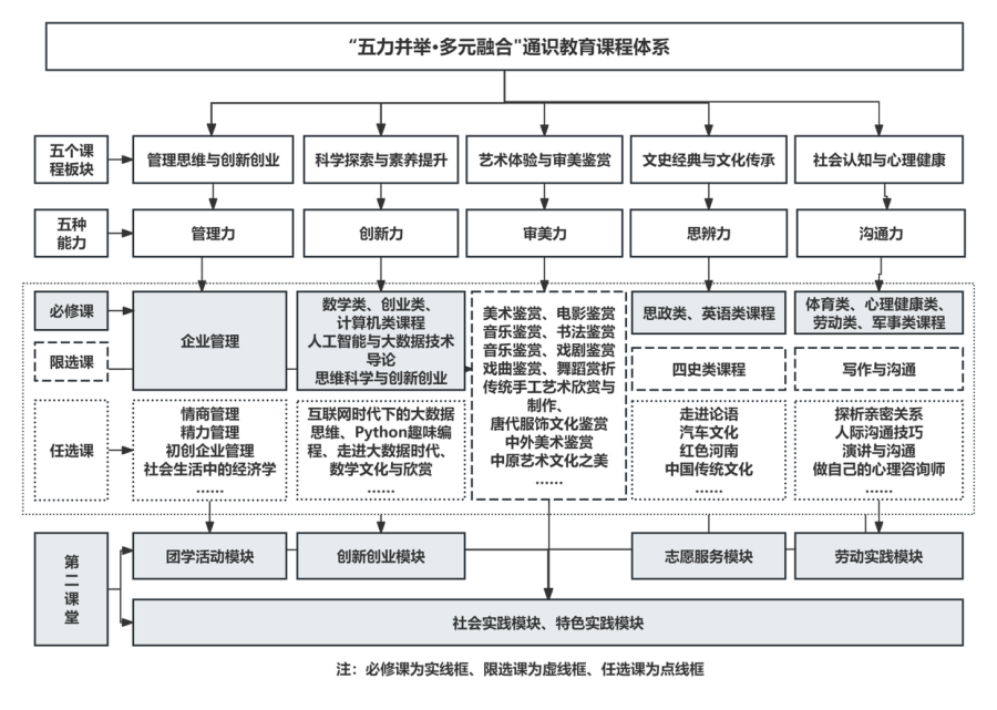 以三个产业链群和三大专业集群为导向,打破学科壁垒,深度融合各类教育资源,结合我校人才培养应用型人才的目标,通识教育课程体系重点培养学生的管理力、创新力、审美力、思辨力、沟通力等“五力”核心能力,精心搭建五大板块的通识课程体系,实现通专融合与理实结合,完成学生成长道路上的“最后一公里”,为学生的未来奠定坚实的基础。