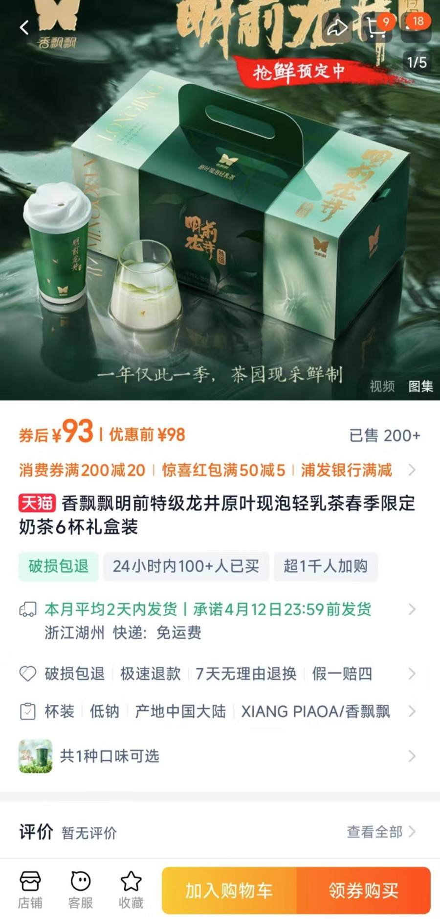 3月27日,话题#香飘飘奶茶涨价至16元一杯#冲上热搜,有网友称香飘飘明前特级龙井轻乳茶定价为98元/箱,每箱6杯,单价较以往产品涨近5倍。