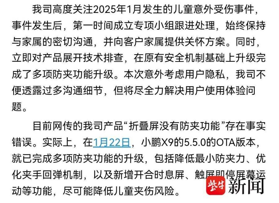 与此同时,小鹏方面称,网传的产品“折叠屏没有防夹功能”存在事实错误。实际上,在1月22日,小鹏X9的5.5.0的OTA版本,就已完成多项防夹功能的升级,包括降低最小防夹力、优化夹手回弹机制,以及新增开合时息屏、触屏即停屏幕运动等功能,尽可能降低儿童夹伤风险。