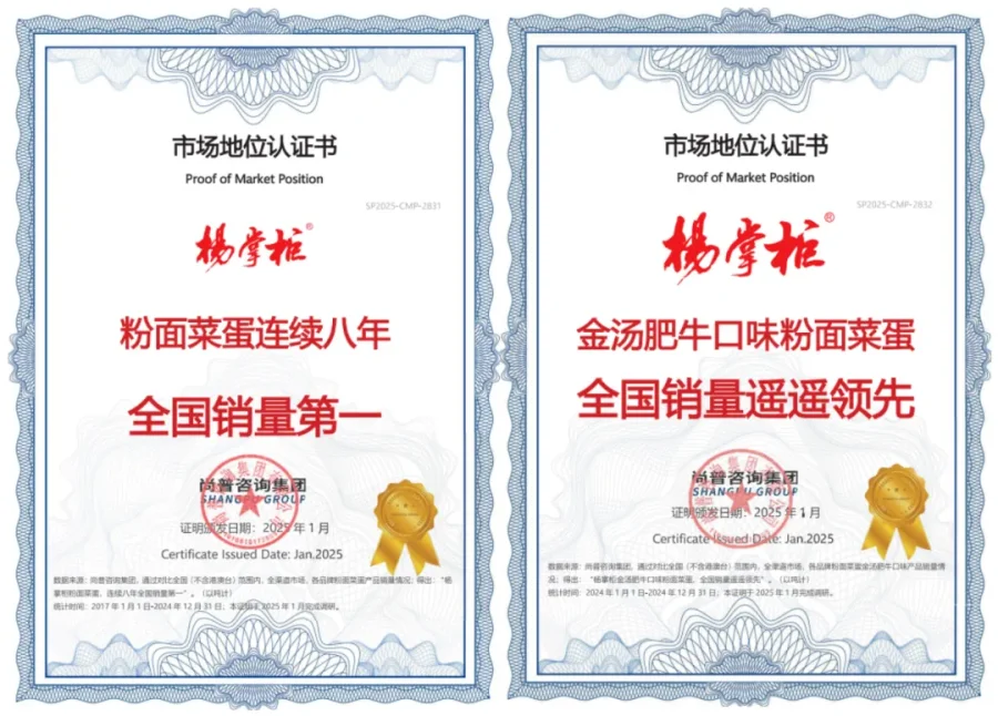前不久,杨掌柜获得“粉面菜蛋连续八年全国销量第一”、“金汤肥牛口味粉面菜蛋全国销量遥遥领先”权威市场地位认证,这便是最好的证明。