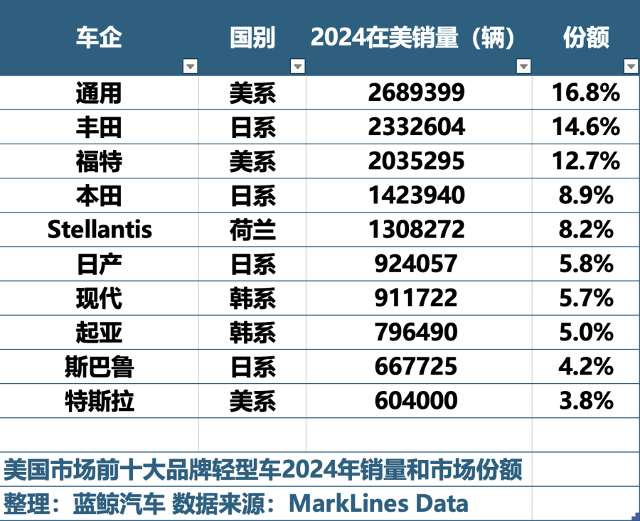 另据蓝鲸汽车梳理调研公司MarkLines数据获悉,2024年,在美销量前十车企中,有7席为非美系,其中,有四席为日系车,分别为丰田、本田、日产、斯巴鲁,在美市场份额合计约33.5%,丰田去年在美销量超233万辆,仅次于通用。