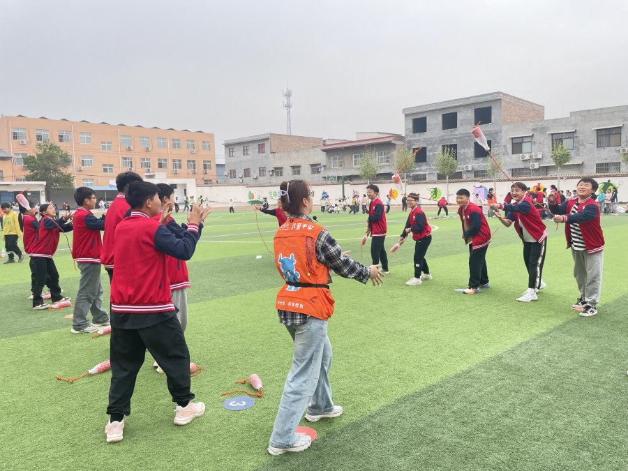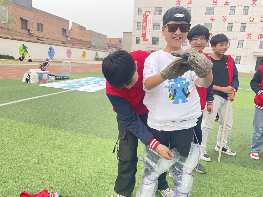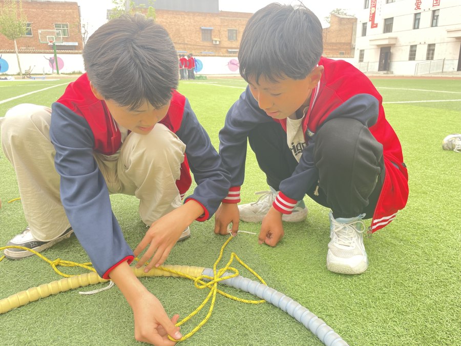 “DIY抛绳器”游戏区域充满了探索的热情。志愿者展示了抛绳器的制作材料和步骤,同学们充分发挥想象力和互帮互助精神,不一会,完成了抛绳器的制作。随后,在志愿者老师的引导下,大家两两分组,以模拟救援现场的方式进行练习,尝试抛出自己制作的抛绳器,感受如何调整力道,以便在洪水救援时能够准确地将绳索抛向被困人员。这个环节不仅锻炼了同学们的动手能力,还让大家了解到抛绳器在紧急救援中的关键作用。