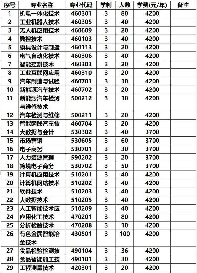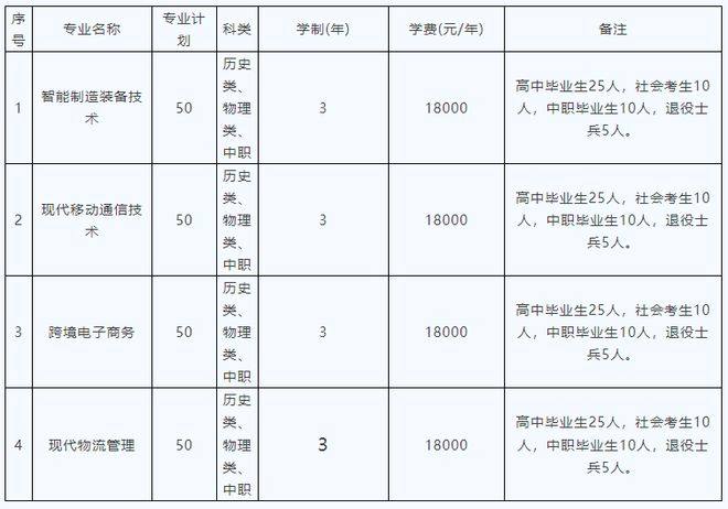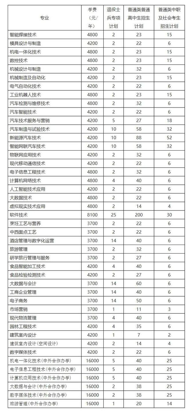 面向中职生考生招生的专业有:电力系统自动化技术(不招收色弱、色盲考生)、风力发电工程技术(不招收色弱、色盲考生)、机电一体化技术、物联网应用技术、现代物流管理等5个现代学徒制专业。