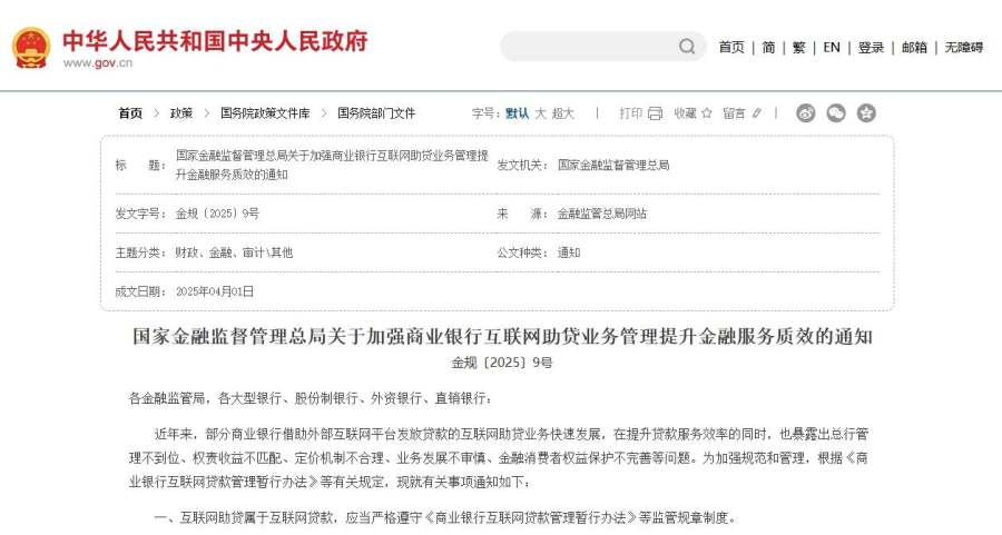 4月3日,国家金融监督管理总局发布《关于加强商业银行互联网助贷业务管理提升金融服务质效的通知》(以下简称“新规”),并将于2025年10月1日起正式实施。