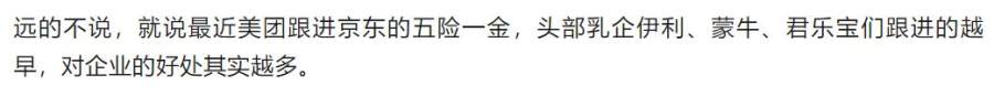 再举一个近期具体事例,在京东给小哥们交五险一金之后,最快反应跟进的就是美团,随后才是饿了么。