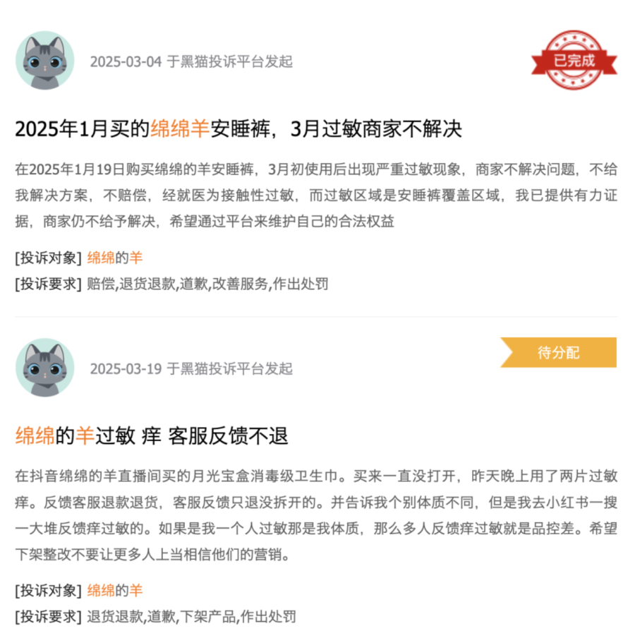 在黑猫投诉上,记者以“绵绵的羊”为关键词搜索发现,出现数十条相关的投诉线索,消费者反馈的多为过敏、异物、商家不解决等问题。