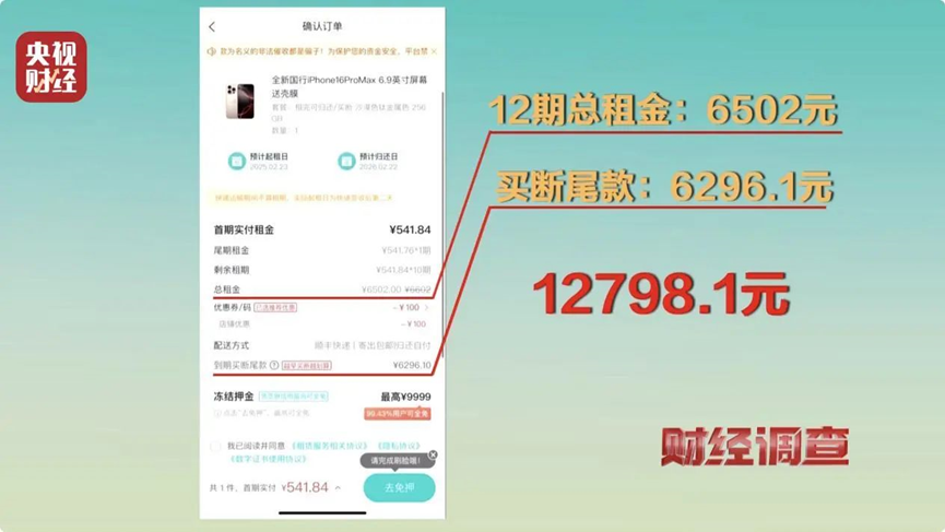 在确认订单页面中,记者发现一款官网售价为9999元的手机,在支付了12期租金6502元后,仍需支付买断款6296.1元,也就是说,消费者在这一年内需要支付12798.1元,这个价格接近该手机官网售价的1.27倍。