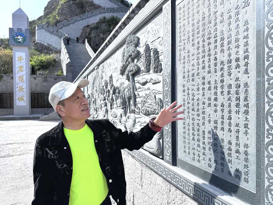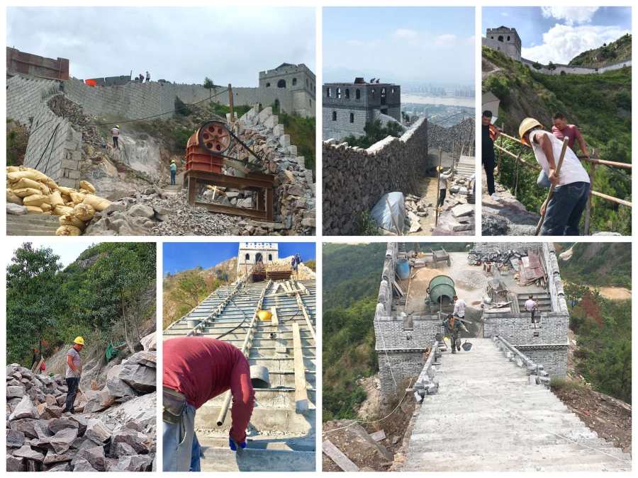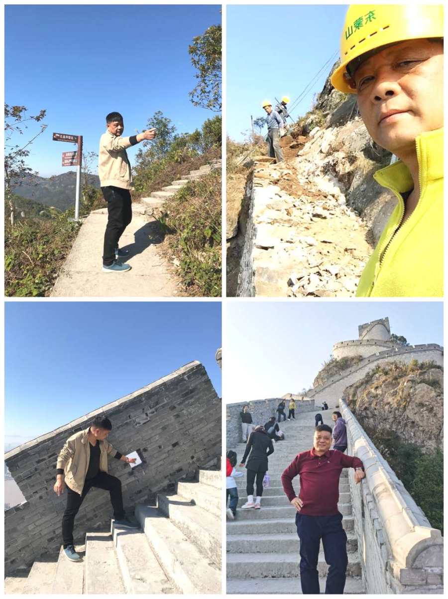 在崎岖溪流间开道,选悬崖峭壁上筑亭;择脊梁处设驿修廊,诠释了无限风光在险峰之经典。从堪察到设计,从开垦到施工,从购物料至上山,从雨季山洪到冬季防寒等,团队成员亲历亲为,面面俱到。为亭台、楼阁、长城、道路筑构,处处求师学艺。为节省费用,整体预期精算精选,将每分善款用在刀刃上为宗旨。支付造册公示;捐赠立碑铭记。陈先生邀亲友自费赴八达岭和嘉峪关长城;观摩、拍照、丈量、用心记录。为保质保量;凡所购物料或长城砖定制,项项把关。为工程进度;监管规划施工,督导安全,特殊时一日登山往返多次。2016年启动“孔雀坪驿站”与南环线牛岩岭的建设计划。以一比一模仿“八达岭长城”的建筑格局;以古温州五县命名:永嘉门、永安门、永乐门、永泰门和永平门,总长度二千多米,现建成“烽火台”三处。历时十五载,终将“东蒙山”成温州网红打卡地,称之为“温州长城”的美誉。