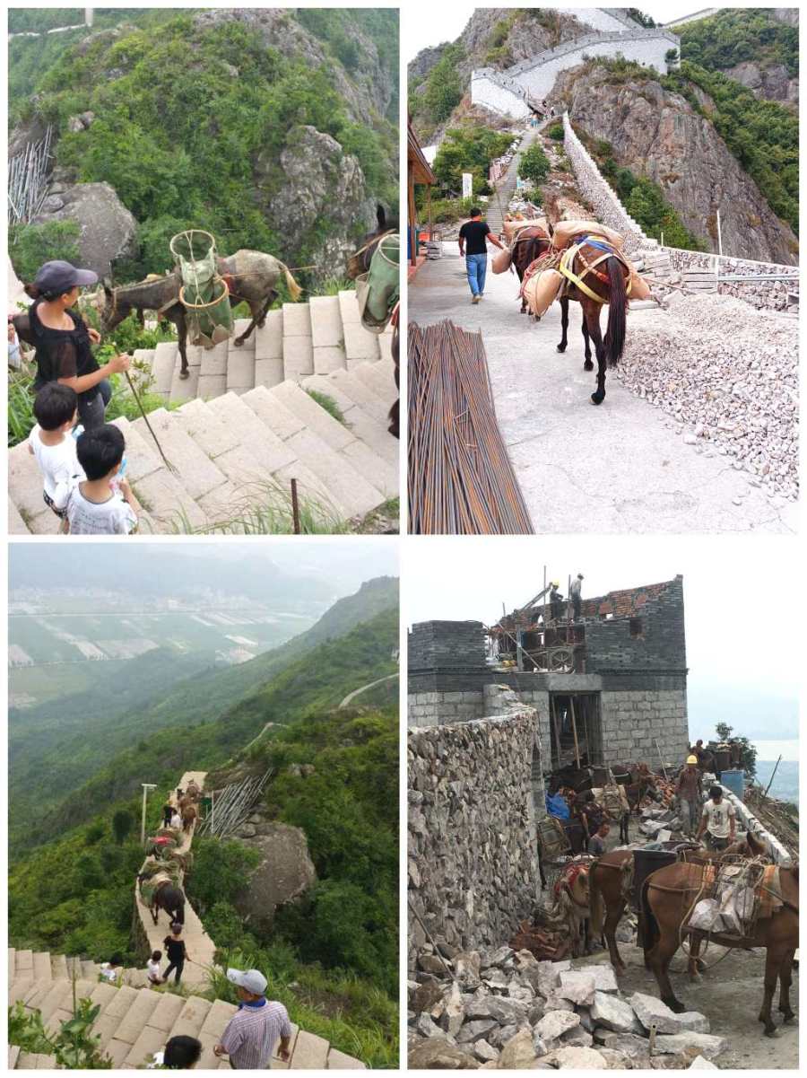 今天拾级攀登时,脚下阶梯的沙石料、施工的设备、工具等,属沿线施工,不便设机械化索道,只能以古法驮物。驮物上山的功臣,非人类的忠诚朋友“骡子”莫属;它那幼黑的皮毛,细小的四肢,驮着三四百斤的物料,走在陡坡与碎石的荒地;杂草或峭壁的岩石边沿;那强健的体魄,也致全身擅抖,极力地拾级向上攀爬;汗如雨下,气喘吁吁,口流白沬,眼眶含泪;背缕的承重与摩擦,致肩背皮开肉绽;夏临酷暑,乘夜间出发驮物料上山;十几年的施工期,日复一日,一趟又一趟,数以万计,如数驮至,从不间断。东蒙山的所有物料无一不是“骡子”的艰难付出。同时,也导致25头骡子付出鲜活牲命的惨痛代价;让人痛心至极啊!