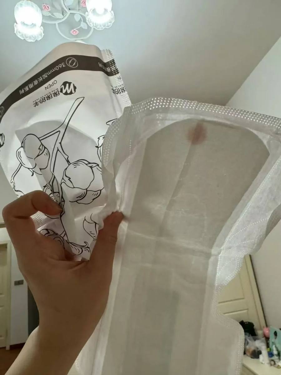 遭遇类似问题的消费者并非个例。另一位消费者展示的同款卫生巾上出现了红色污渍,严重影响使用。