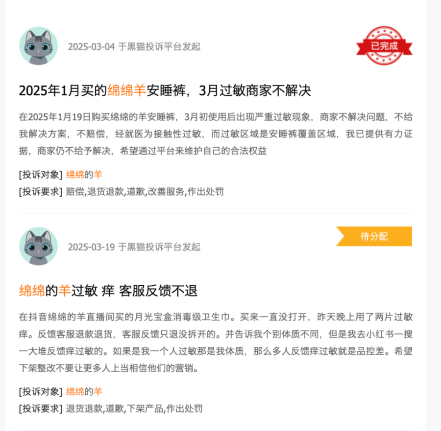 目前,已有十余位消费者向媒体投诉“绵绵的羊”产品存在质量问题,包括卫生巾和安睡裤中出现红色斑迹、黑色异物、黄色污渍等。在黑猫投诉平台上,关于“绵绵的羊”的投诉也多达数十条,主要集中在过敏、异物以及商家不解决问题等方面。