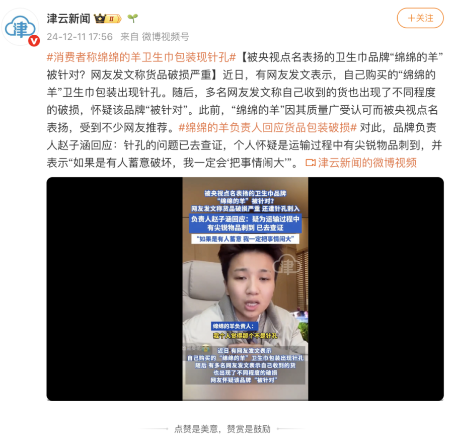 事实上,“绵绵的羊”已多次面临投诉风波,早在2024年12月,有多名消费者反馈购买的“绵绵的羊”卫生巾包装出现针孔。彼时创始人赵子涵回应:“针孔的问题已去查证,初步推测为运输过程中被尖锐物品刺穿。”