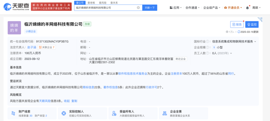 根据消费者提供的卫生巾外包装信息,“绵绵的羊”卫生巾的产品责任单位为临沂绵绵的羊网络科技有限公司,生产企业为诺宸股份有限公司。天眼查显示,临沂绵绵的羊网络科技有限公司成立于2023年9月,注册资本100万元,法定代表人正是网红赵子涵本人。