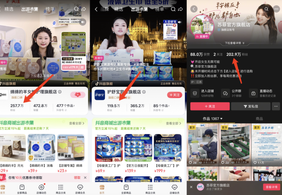公开资料显示, 2024年底,众多大牌卫生巾因尺寸虚标问题集体塌房,“绵绵的羊”却借势爆红,账号单月涨粉200万。截至目前,网红赵子涵粉丝126万,“绵绵的羊”女性护理旗舰店粉丝257万,后者粉丝甚至远超苏菲200万、护舒宝120万等一众大牌,成为卫生巾品牌的新顶流。